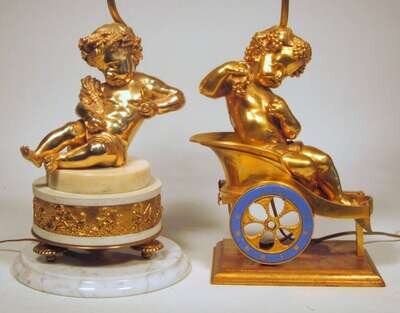 One seated on a carriage form clock face; the other on a white marble plinth, now mounted as lamps.