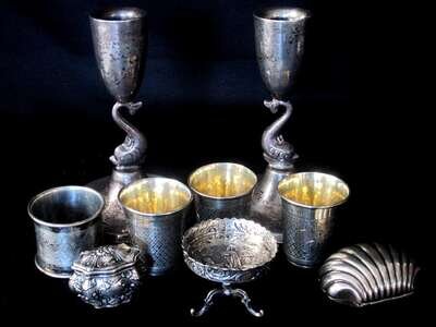 Pair of Mexican dolphin shaft console candlesticks, three Russian silver niello wine cups, a Russian engraved napkin ring, a Dutch miniature pedestal base tea table, a German silver oval repousse pill box and a "clam shell" box.