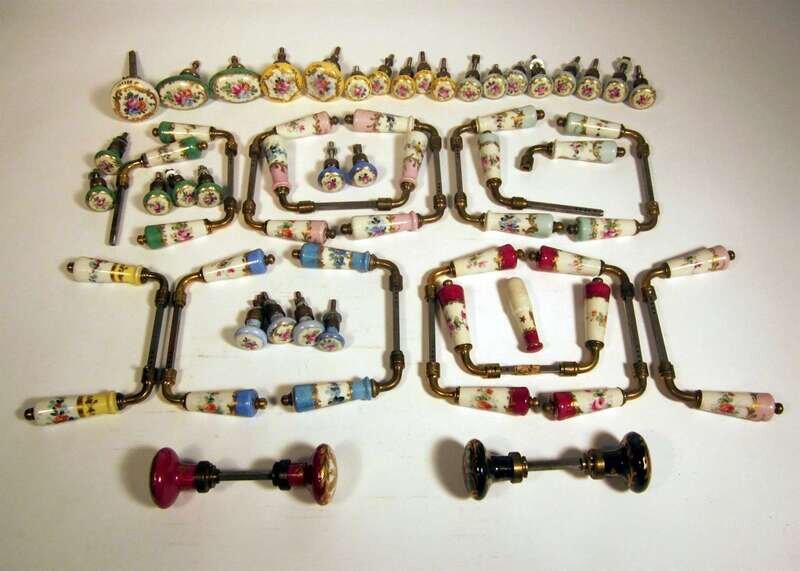 Comprising door handles, knobs and various drawer pulls, all hand painted with floral sprays on various grounds. (Approimately 40).