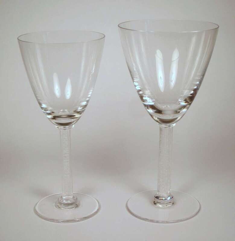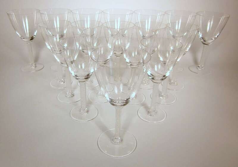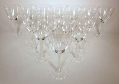 Plain inverted bell form bowls, square "frosted" shafts, comprising eleven white wines and eight red wines.