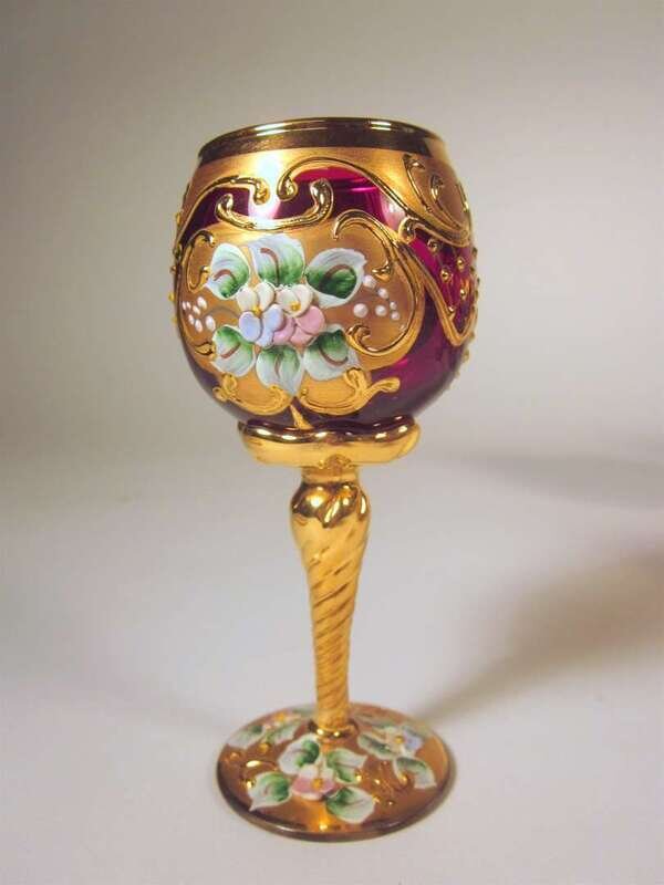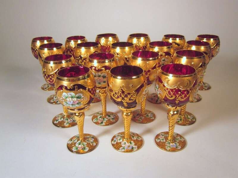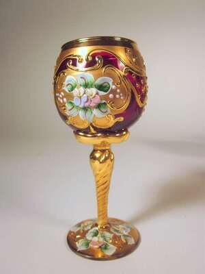 The ruby red glass gilt in rococco style, painted with flowers, above a twisted stem on circular foot. (18).