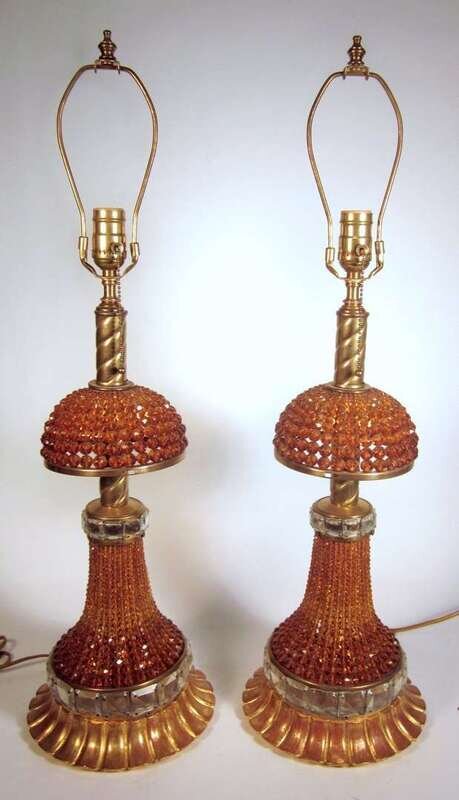 Pair of Continental amber colored glass bead and brass lamps 20th century