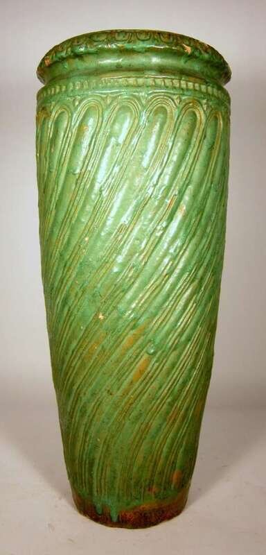 Large and heavy green glazed pottery umbrella stand.