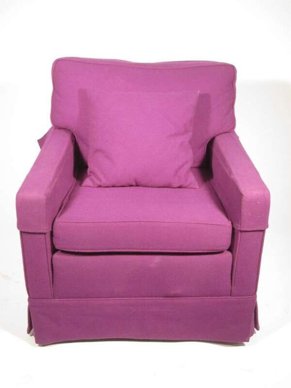 With square back and arms, loose back and seat cushions, upholstered in purple canvas.