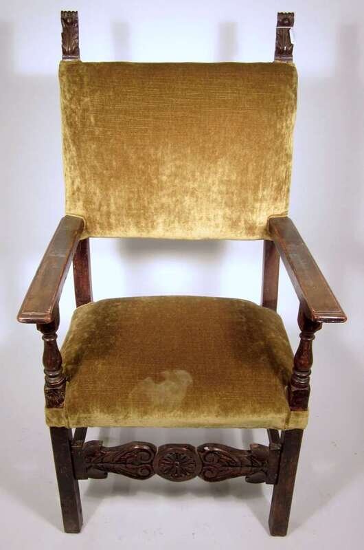 In the 17th century style, the rectangular velvet upholstered back over straight arms above turned supports, the conforming stuff over seat above carved apron, raised on straight legs.