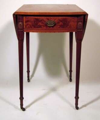 The shaped rectangular top flanked by twin D-shaped ends, over single drawer to the frieze, raised on cylindrical reeded legs, terminating on brass castors.