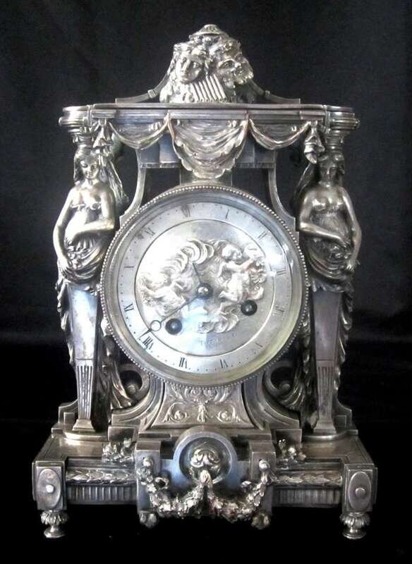 Circular face with circular cupid repousse face with black Roman numeral chapter ring, mounted above with a table with heads of pan and a maiden and drapery below, flanked by two females, rectangular base with drapery and wheel on four leaf and turned feet, hour strike.