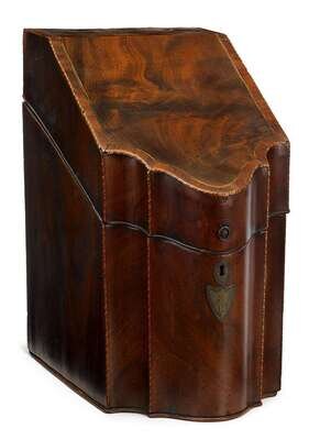 Typical form, the sloping hinged lid opening to a fitted interior, contrasting barber pole band inlay.