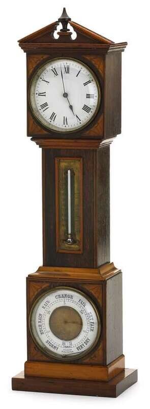 The broken pediment top centered by an urn, over a white enameled circular dial with roman numerals, with inlaid spandrals at corners, above a mercury thermometer with brass plate, the base with French circular barometer with inlaid spandrals at corners, raised on rectangular base.