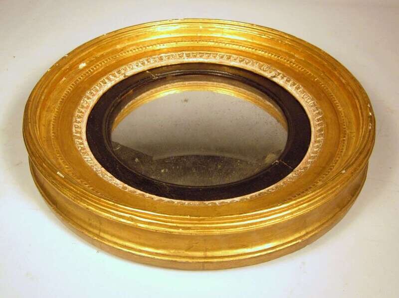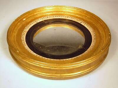The convex mirror plate within a circular ebonized wood and giltwood frame.