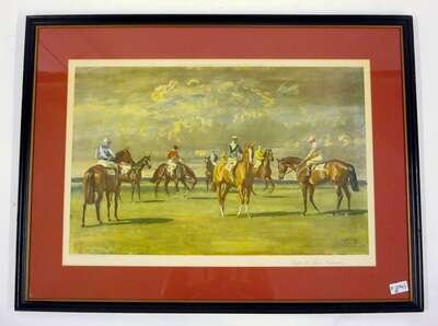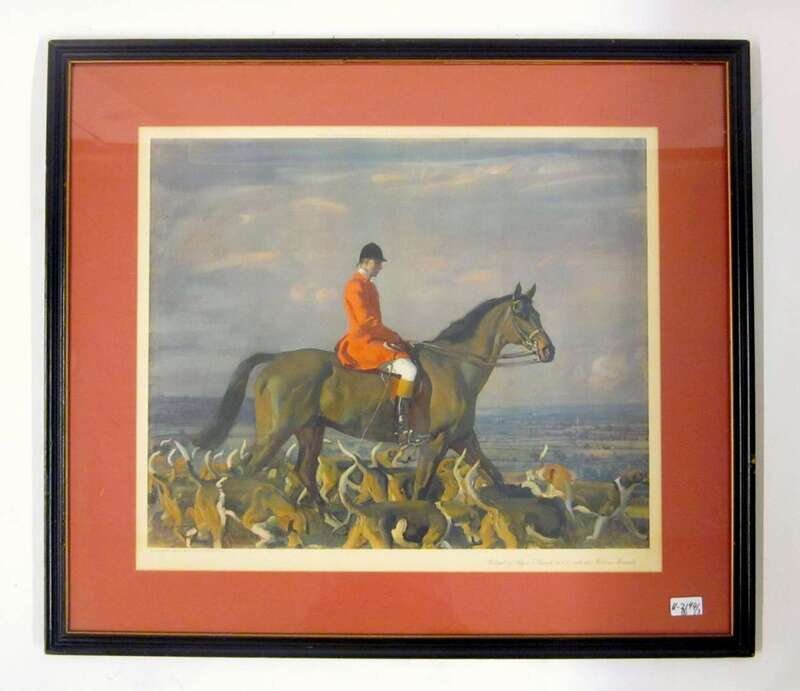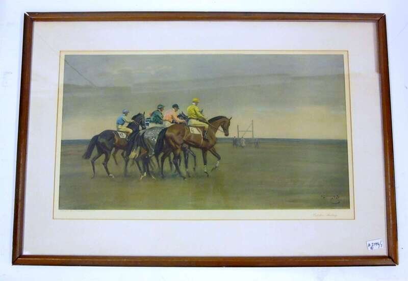 Titled 'Before the Start, Newmarket"; "Portrait of Major T. Bouch, M.F.H. with the Belvoir hounds"; and "October Meeting", all published by Frost and Reed, Bristol and London. Framed and glazed.