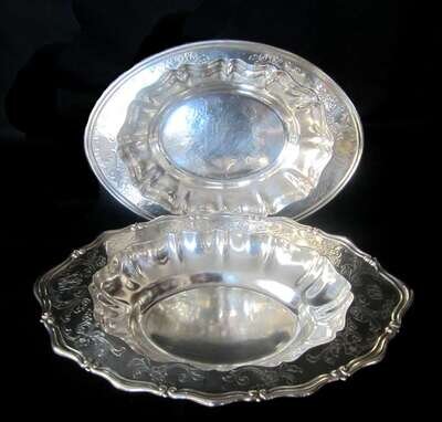 Oval serpentine bottom with scroll engraving, the lid with a removable handle and the top and bottom of the rim is engraved to match base.