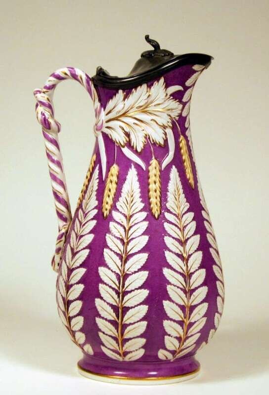The shaped cover surmounting the baluster body, issuing a rope twist handle showing molded leaves on purple ground, registration mark molded to base.