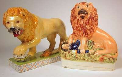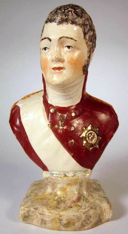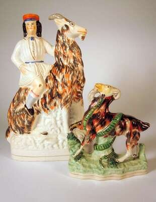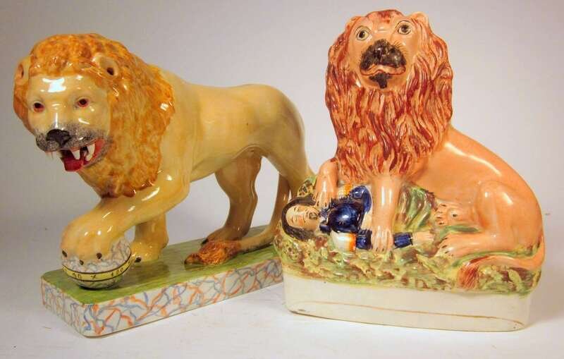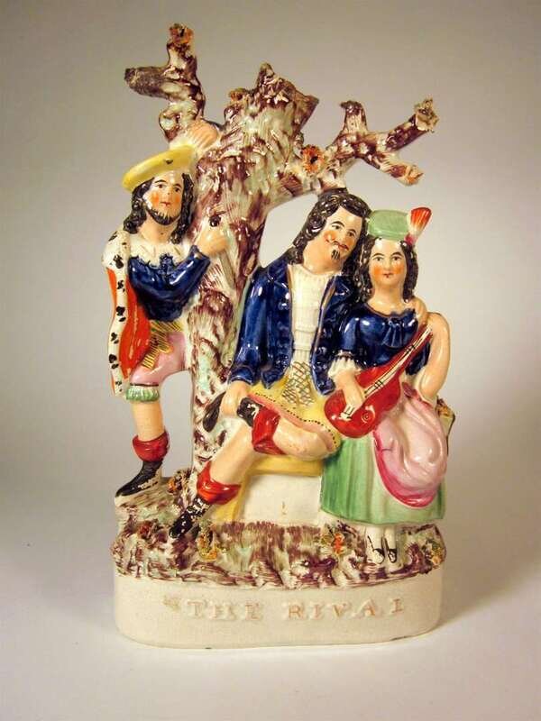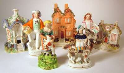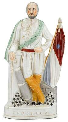 Comprising a bust of Tsar Alexander I in uniform; a figural spill vase titled "The Rival" depicting an amorous couple sitting beneath a flowering tree with a jealous onlooker; a figure depicting an aged Garibaldi in uniform; a group of items comprised of a Victorian home, a cottage, a chapel, a young man with a basket, a young maiden with a basket, a young girl seated on the back of a sheep, and a young lady with a spotted dog; a figural group depicting a triumphant lion squatting on Napoleon III; a Staffordshire style figure of a lion with paw resting on a celestial globe; and a pair of figures,the first modeled as a young man seated on the back of a billygoat, the other modeled as a ram being constricted by a snake. (16).