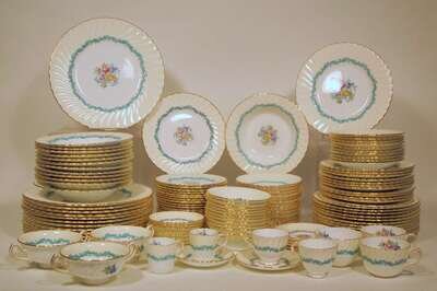 Comprising thirteen dinner plates; thirteen luncheon plates; thirteen salad plates; thirteen rimmed soup bowls; eighteen bread plates; thirteen tea cups and saucers; fifteen sauce bowls and ten underplates; twelve dessert bowls; five demitasse cups and six underplates; eleven coffee cans and nine underplates. Apporximately 160 pieces.