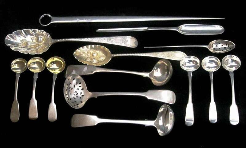 Comprising three fiddle-handled sauce ladles, one pierced, six fiddle-handled salt dips, meat skewer, marrow scoop, two berry spoons and mote spoon.