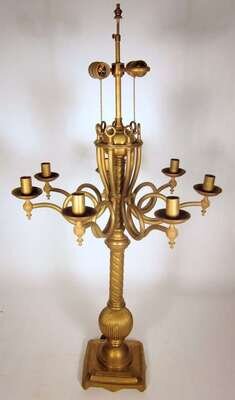 The spiral standard supporting seven candelarms above a fluted sphere, on a square base. Two electrified fixtures to the top.