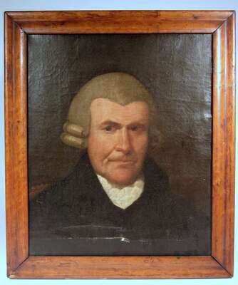 Oil on canvas, depicting the bewigged man in cravat and black overcoat sat in an upholstered chair. Framed.