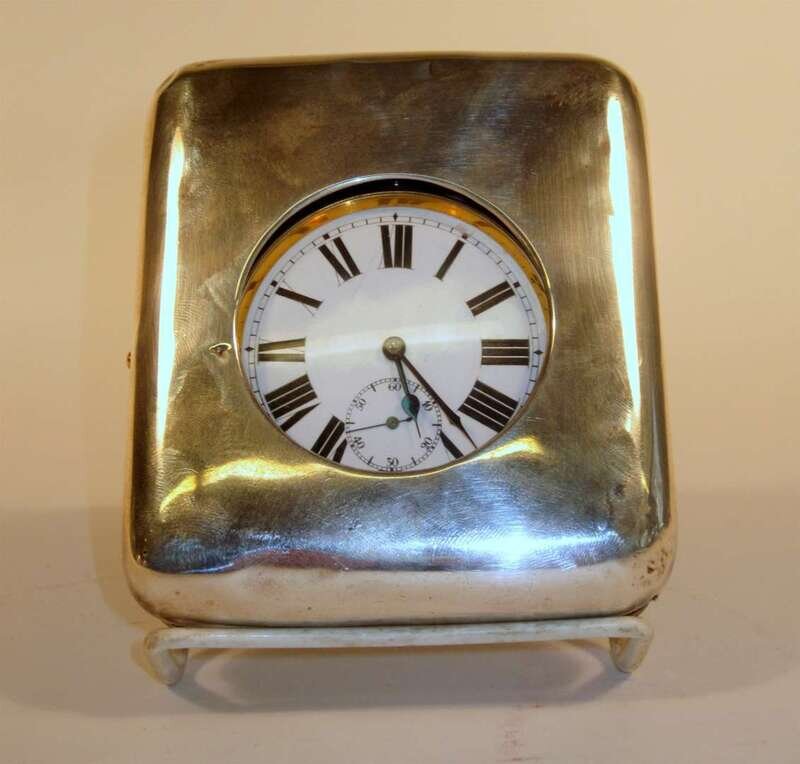 The watch with white enamel dial bearing roman hour markers, the case stamped "Swiss Argentum", within a silver clad morocco leather travelling case, hallmarked London 1908.