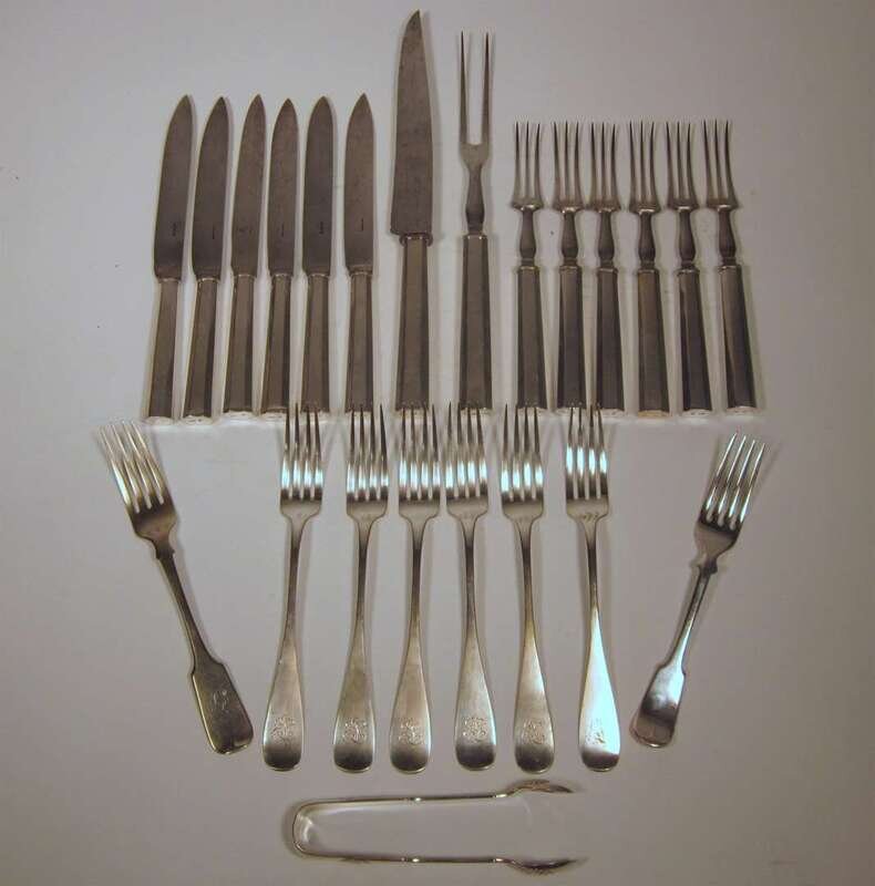 Comprising six knives and six forks, and a matching carving knife and fork; together with six silver forks, indistinct marks, possibly St. Petersberg, anda silver plated tong. (21). Two forks pictured NOT included.