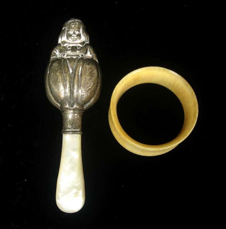 Mother-of-pearl handled "Humpty-Dumpty" infant's rattle early 20th century