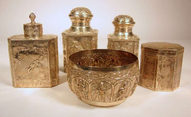 Comprising three repousse worked boxes with pull-off lids, one octagonal box with hinged lid. Together with a Persian silver, repousse worked bowl. (5).