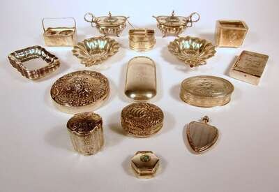 Including a pair of Continental silver lidded salts with glass liners, stamped 800 to undersides; a Gorham sterling silver compact; nine Reed and Barton silver pin trays; a small Continental silver book-form snuff box; a small Continental silver oval snuff box; and a small plain spectacles case, stamped Sterling; together with approximately 10 other items.