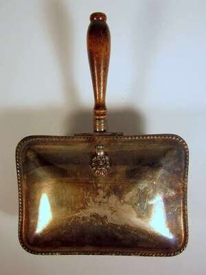 Rounded rectangular form, the monogramed domed lid with gadrooned edge, the body of similar form and wooden handle attachment, terminating in scroll feet. Stamped 'F.B. Rogers Silver Co / silverplate / 186' to the underside.