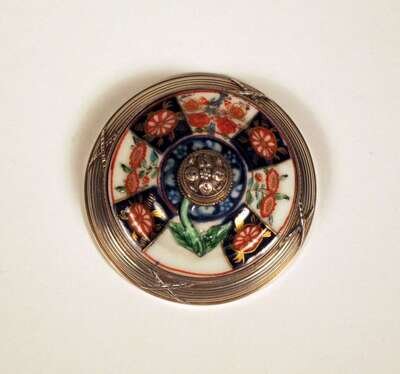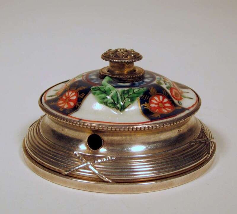 Circular form, with foliate decorated push button within an imari painted border, reeded band to base. Hallmarks to underside and sides.