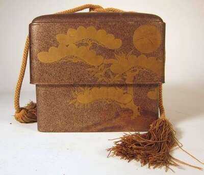 Rectangular form with domed pull-off lid, decorated with gilt mon in a landscape, the silk rope tie attached by gilt bronze mounts.