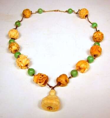 Comprised of eleven small spheres carved to show animals or figures, one mounted with seed pearls, interspersed with jadeite beads, and hung with a small carved ivory buddha; together with a pair of conforming carved ivory earrings. (3).