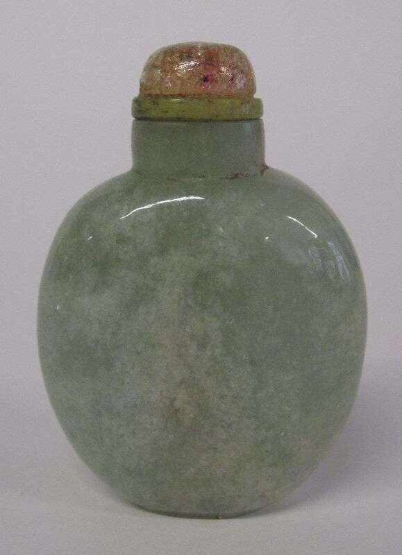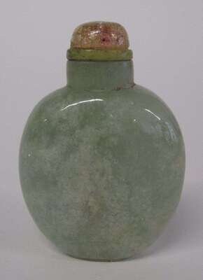 The unadorned ovoid bottle of evenly mottled apple green hue.