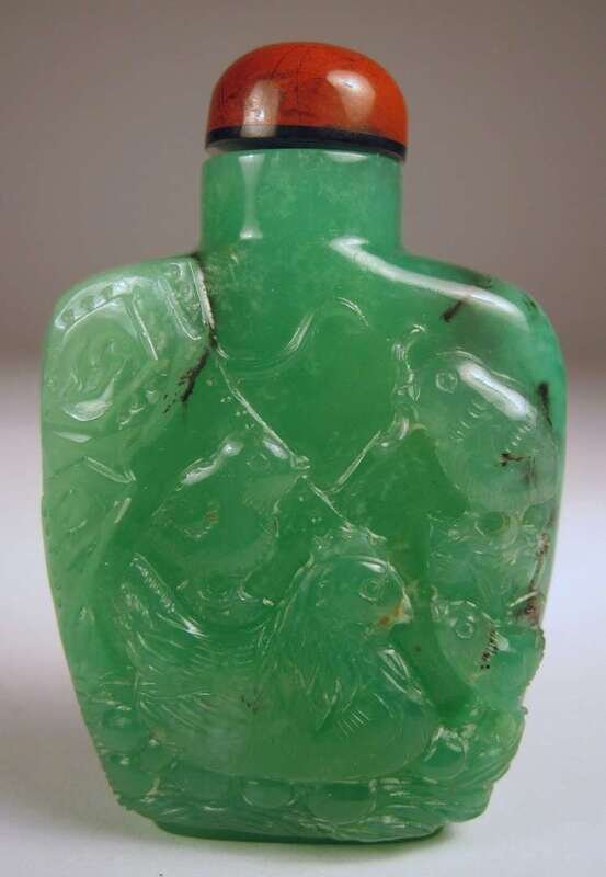The rectangular bottle carved in deep relief to depict an asemblage of fowl ; stone of bright green hue with few black inclusions.