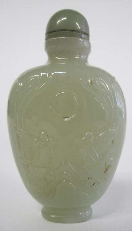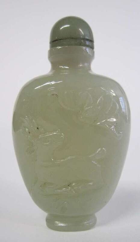 The shouldered ovoid bottle carved in relief to show a deer, fu bat and two mirrored nightengales; stone of slight celadon hue.