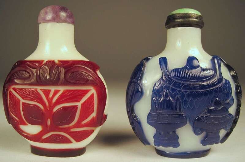 Comprising a rounded milk glass bottle with blue overlay archaic censers and a similar milk glass bottle with a red overlay archaic design.