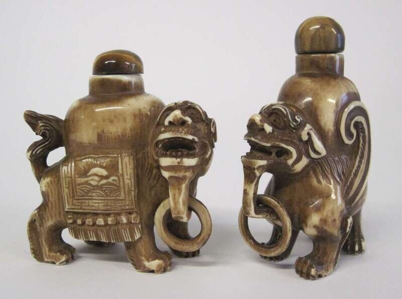 The two similar bottles carved as fu lions with freely-hanging rings at neck.