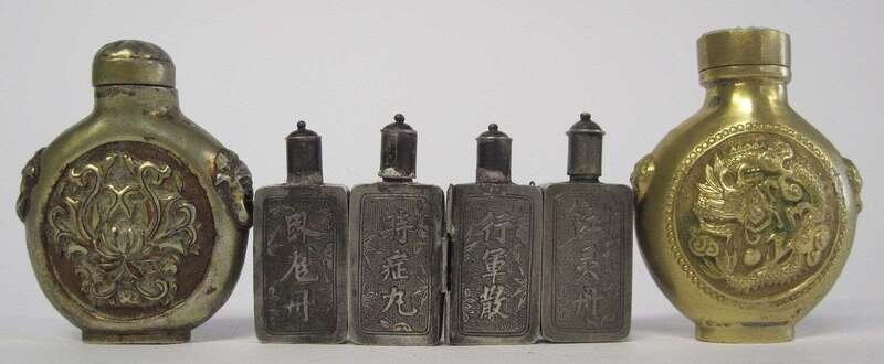 Comprising two round yellow metal snuff bottles molded with mask handles and decorative panels and a joined four-part white metal medicine bottle.