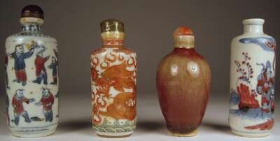 Comprised of one monochrome, two copper and blue glazed and one iron red and gilt decorated cylindrical form bottle.