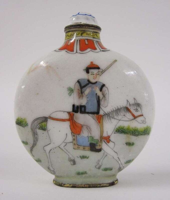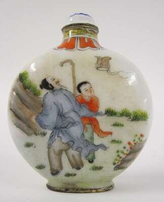 Of flattened circular form, painted to face with a scene of father and son flying a kite and to verso a Qing soldier on a galloping horse.