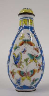 Of flattened ovoid form with tapering shoulders, enameled with colorful fluttering butterflies.