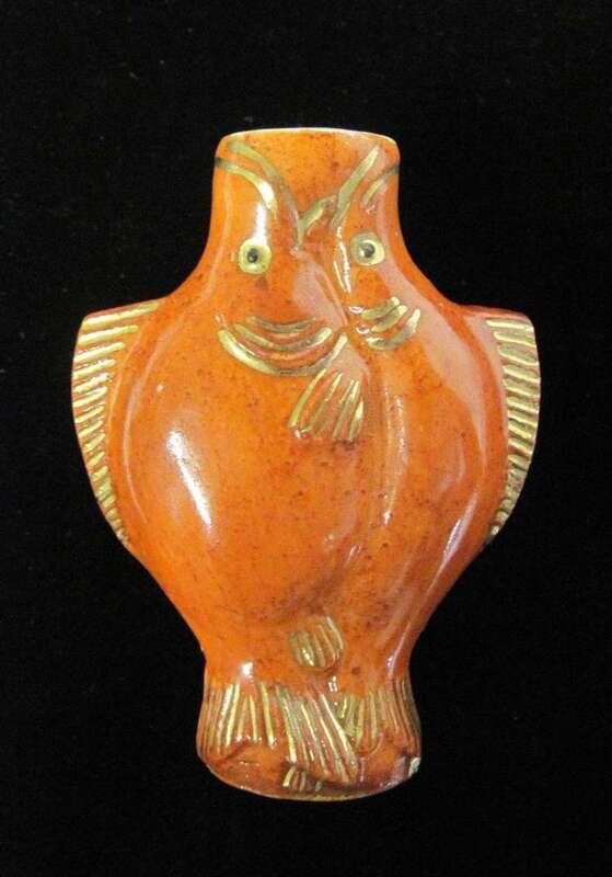 The bottle molded in the form of two joined fish and enameled in orange with gilt highlights.