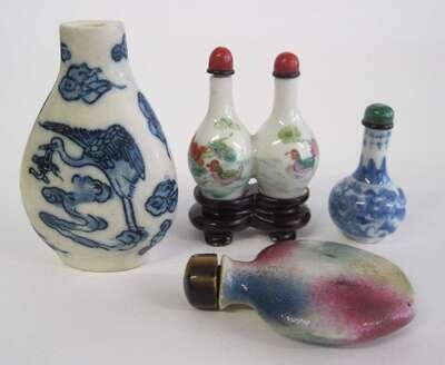 Comprising a large blue and white pear form bottle; a smaller blue and white vase form bottle; a flattened ovoid bottle with rainbow colors; and a conjoined famille rose double vase form bottle (4).