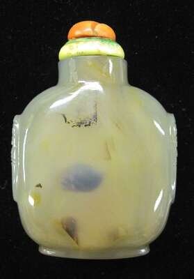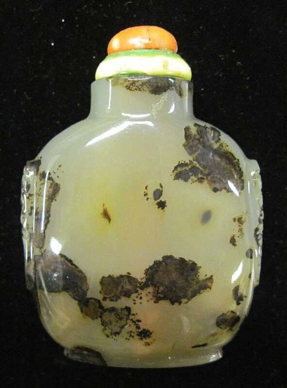 The large square-form bottle carved with lion mask handles at sides; stone with occasional dark inclusions.