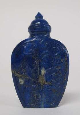 The ovoid bottle carved in relief to sides with lotus blossoms; stone of bright blue color with gold fleck inclusions; matching cap.