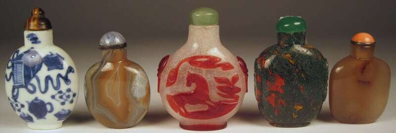 Comprising a glass overlay snuff, three agate and a blue and white porcelain snuff.