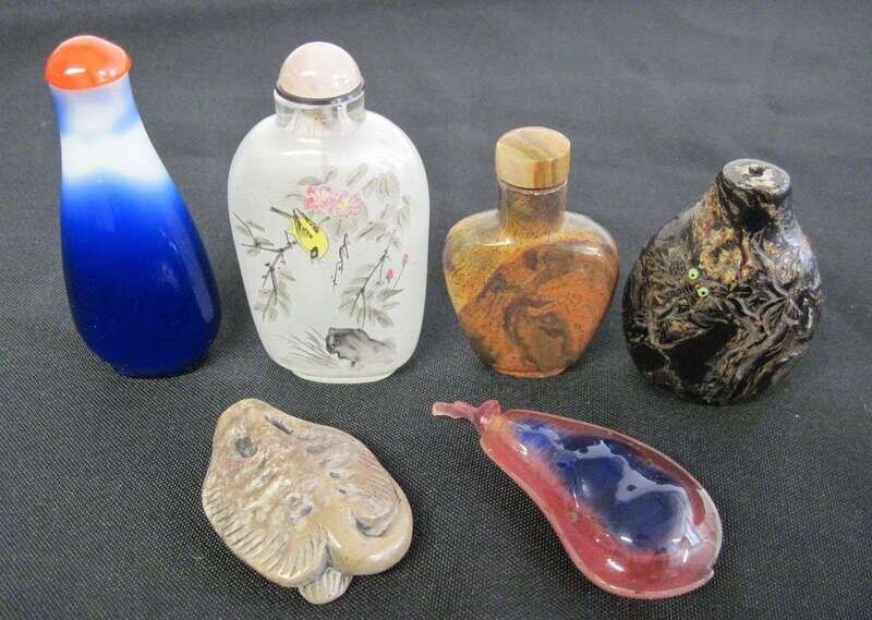 Comprising a pink and blue glass bean pod snuff; a blue and milk white elongated snuff; an inside painted rounded snuff with birds; a carved tree resin on pottery bottle; a soapstone stingray-form bottle and an ovoid volcanic stone bottle of orange hue (6).