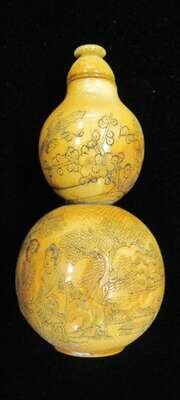 The gourd-form snuff incised and stained to show figures in an idyllic outdoor landscape.