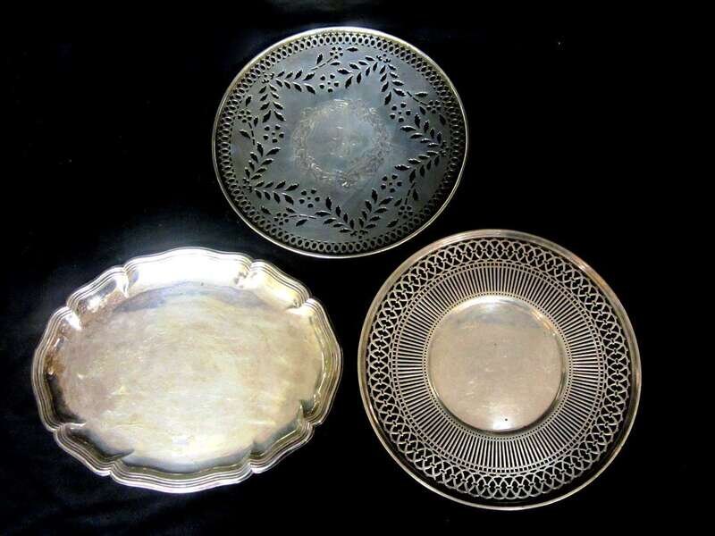 The cake trays are sterling with openwork design; the chop platter is oval, Continental, with a molded border.