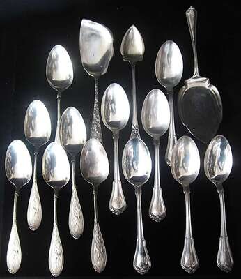 Six "Norfolk" pattern tablespoons by Gorham, six tablespoons with oval handles chased with exotic birds and three miscellaneous pie and pudding servers; together with an oval silverplate covered vegetable dish, monogram.