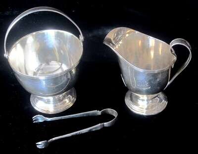 The creamer with a scrolled handle and the sugar having a swing handle, each having a banded border and stepped circular base, monogram together with sterling silver sugar tongs by Wallace Silversmiths, Wallingford, Ct.